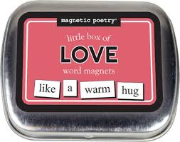 Tiny but full of feeling, this magnet set is made for leaving love notes in unexpected places. The set includes 72 mix-and-match word magnets, all centered around romance, packaged inside a small (2" X 2.5"), reusable metal tin.