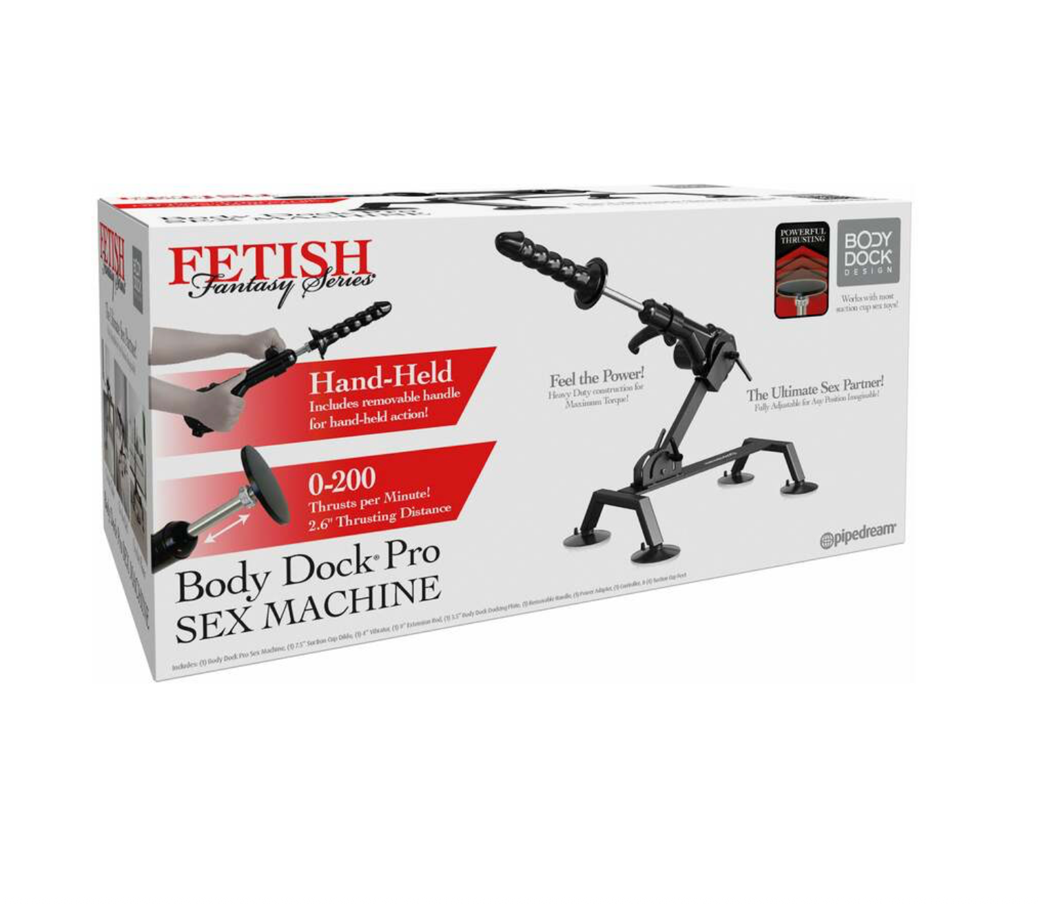 Built for power and versatility, the Body Dock™ Pro Sex Machine delivers up to 200 thrusts per minute with an adjustable thrust angle and 9-inch extension rod for endless positioning options. Its steel frame and 4 suction cup feet ensure stability, while the patented Push & Play docking plate lets you attach most suction-based accessories—even ones you already own.