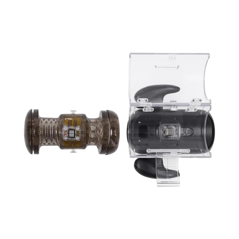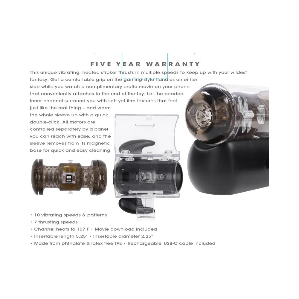 This advanced stroker delivers customizable pleasure with powerful thrusting, deep vibrations, and a warming sleeve that heats up with a quick double-click. Gaming-style side handles provide a comfortable grip, while the built-in phone mount lets you enjoy a complimentary erotic movie hands-free.